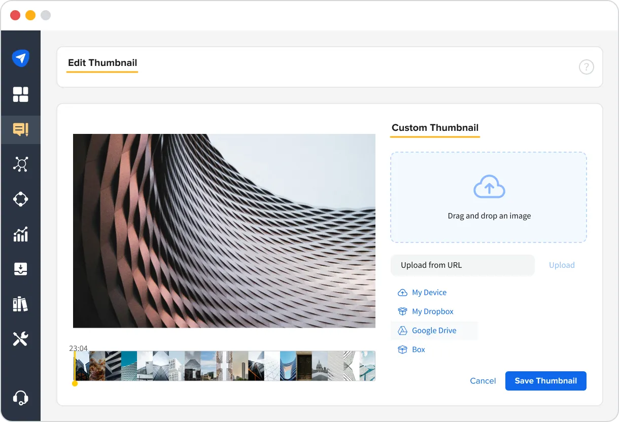 - Upload a custom image to set as a thumbnail from your local device or from a cloud platform.