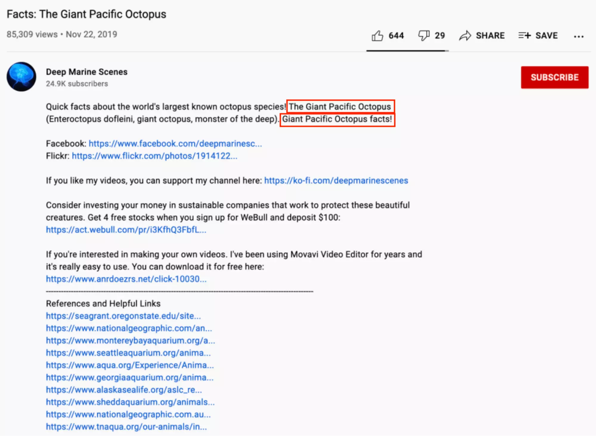 In an example by Deep Marine Science, the channel packs its description full of keywords such as ‘The Giant Pacific Ocean’ in order to boost its chances of appearing in relevant searches.